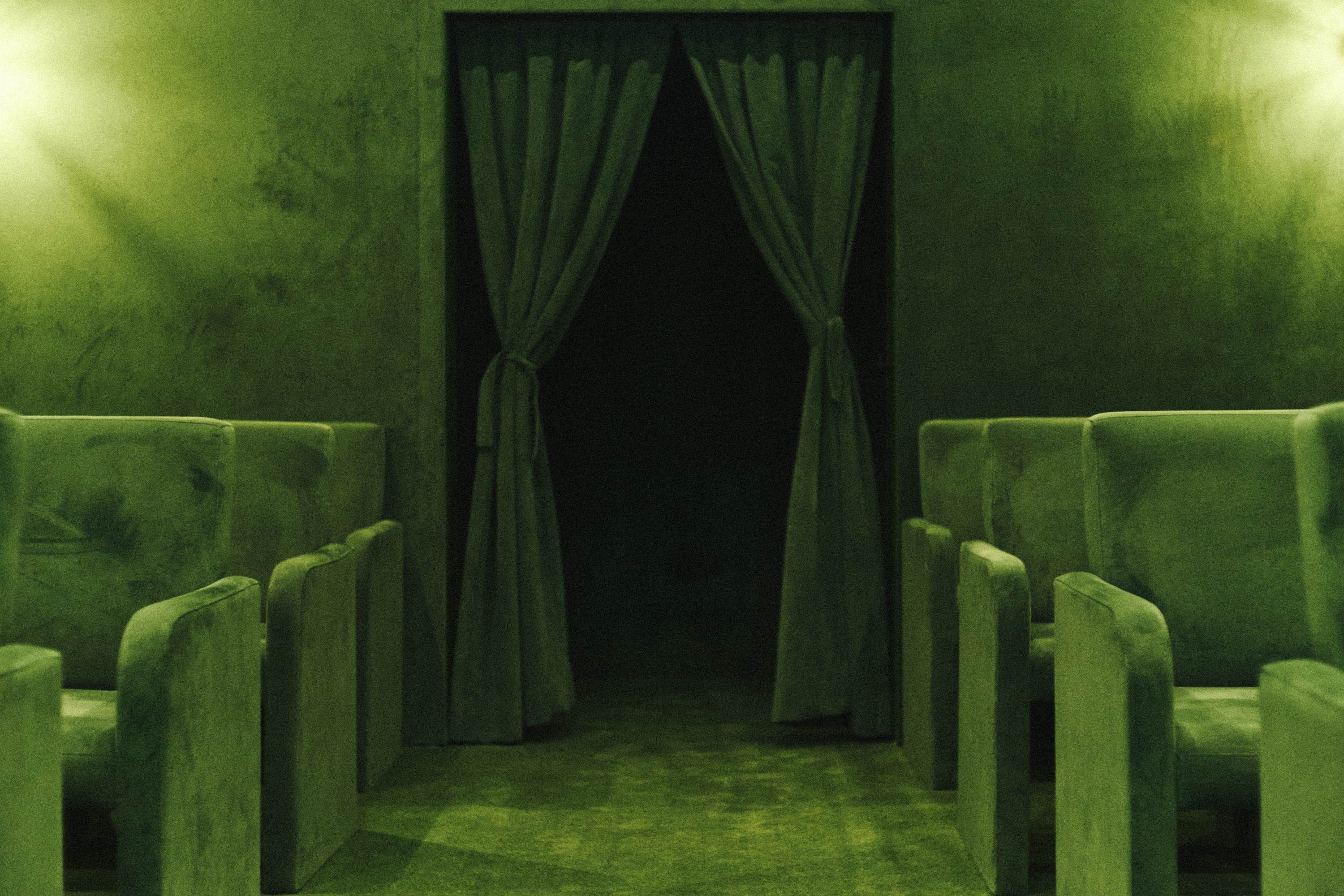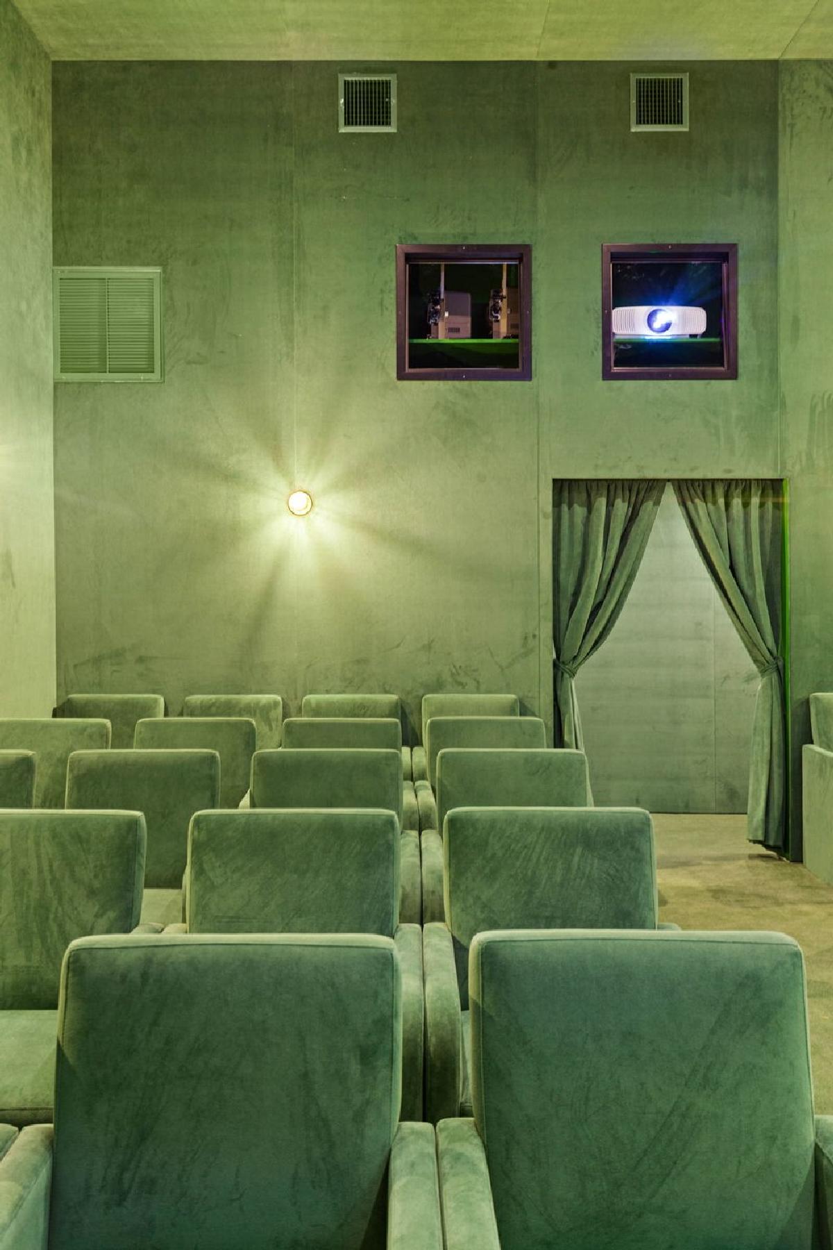 The bookstore–a straightforward, bold, minimal first impression, plays host to a curated selection of media framed by wooden millwork, simplified geometries, softened by velvet valances, upholstered cushions, and a patterned rug that anchors the room. The viewing hall is saturated in green where everything is blanketed in the same green velvet material, creating an intimate, theatrical atmosphere for vieweing films and hosting discussions. Finally, a dreamy lounge space can be found on the lower level, where mixtures of green stone, warm lighting, graphic checkered flooring, and black leather seating merge to create a cozy, dreamlike post-viewing space.